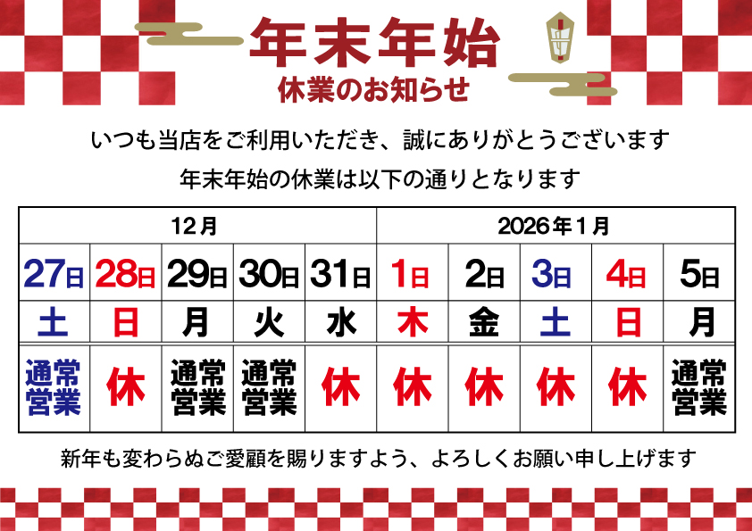 さて、年末年始の休業につきまして以下の通りご案内申し上げます。